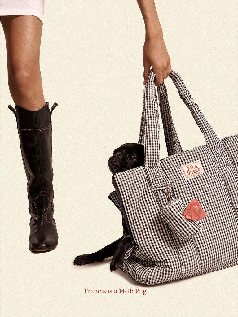 Our signature puffy carrier is super lightweight, airy, and breathy. Also it's super versatile, we sometimes even use it as a regular ol' bag to carry all our stuff. With this super cute carrier, please feel free to take your pups everywhere. Take them on the subway or on the bus, to the store, or wherever you need to go. FYI though - technically, this is not TSA compliant because it doesn't have a mesh top and it's a bit bigger. This carrier also comes with a matching poop bag holder...CUUUUUTE.
